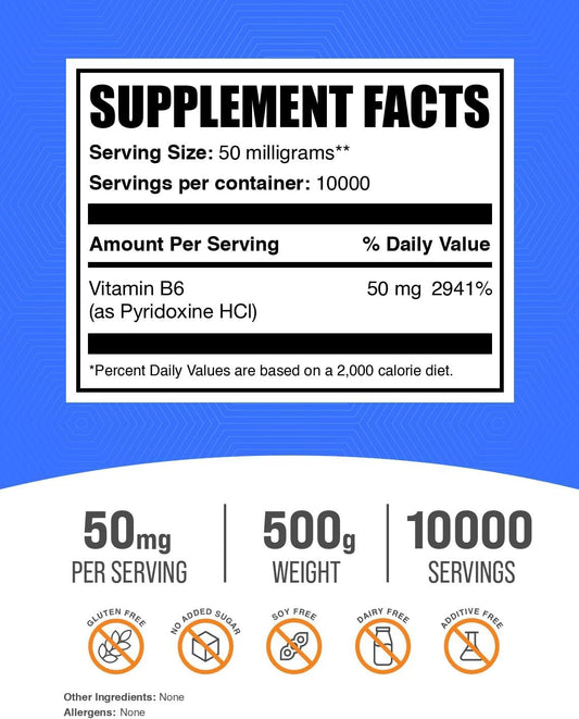 Pyridoxine HCl Powder - Vitamin B6 Supplement for Immune Support - 500g (1.1 lbs) - Gluten Free - 50mg Pyridoxine B6 per Serving