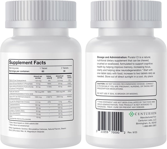 Centurion Puralor CI Brain Supplement - Memory & Focus Boost with Folate, NADH, B Vitamins - 60 Tablets for Teens & Adults