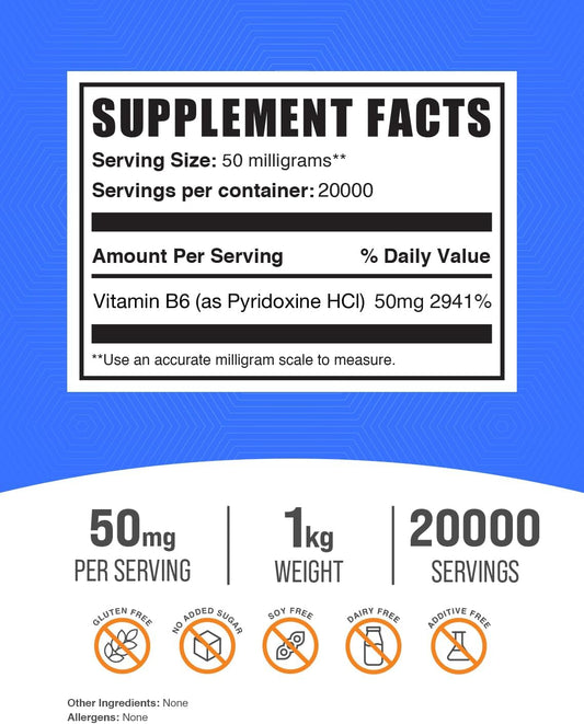Pyridoxine HCl Powder 1kg - Vitamin B6 Supplement for Immune Support, Gluten Free, 50mg B6 Per Serving - Bulk Size Pack
