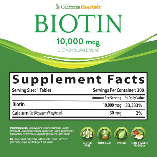 High Potency California Essentials Biotin 10000mcg Supplement for Healthy Skin, Hair & Nails - Non-GMO, Vegan, Gluten & Dairy Free - 300 Tablets