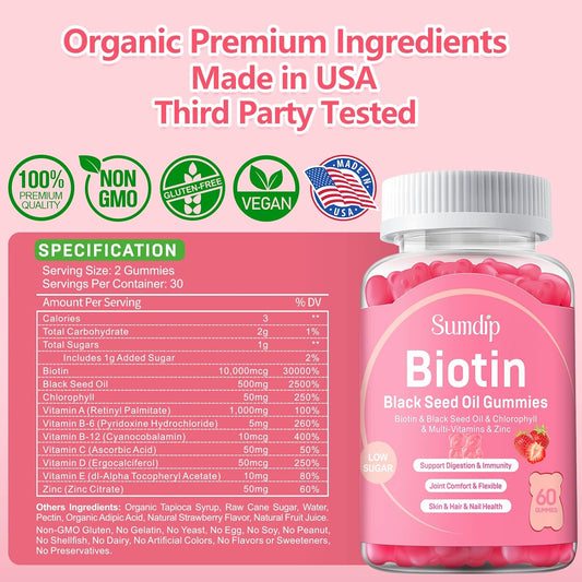 Organic Vegan Black Seed Oil Gummies with Biotin for Healthy Hair, Skin, and Nails - Immune Support Supplement with Chlorophyll, Zinc, and Vitamins A, B6, B12, C, D, E - 60 Gummies