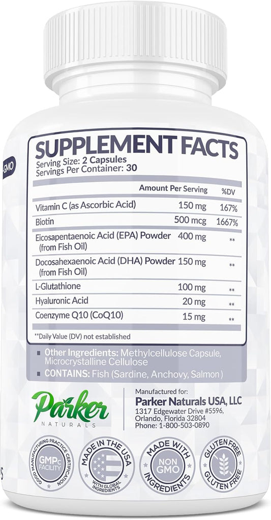 All Natural Glowing Skin Supplement with Biotin, Glutathione, Hyaluronic Acid, Omega 3 Fish Oil, CoQ10, Vitamin C - 60 Capsules by Parker Naturals