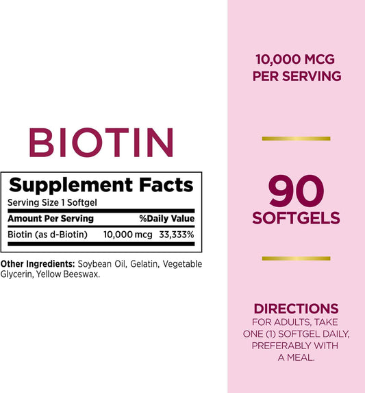 Biotin 10000mcg Supplement for Healthy Hair, Skin, and Nails - 90 Rapid Release Softgels
