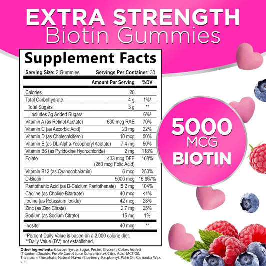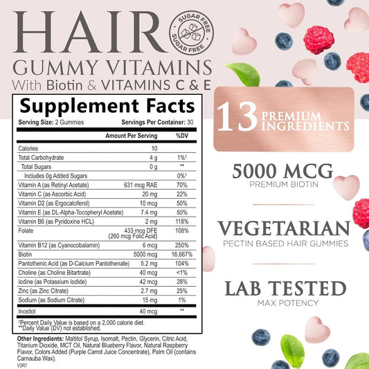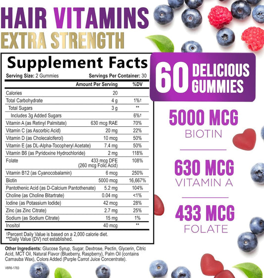 Hair Vitamins Gummy with Biotin 5000 mcg for Stronger Hair, Skin, and Nails - 60 Gummies, Non-GMO & Gluten Free