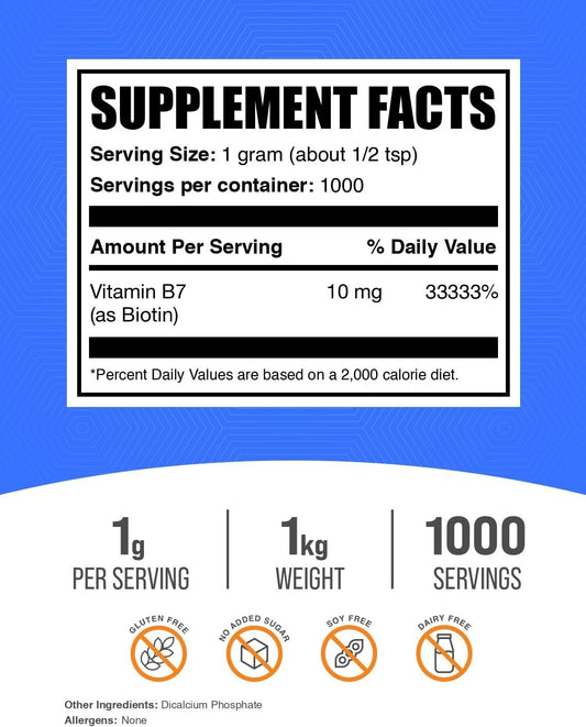 BulkSupplements.com Biotin Powder 10000mcg - Vitamin B7 for Hair, Skin, Nails - Gluten Free, 1000mg per Serving, 1kg (2.2 lbs)