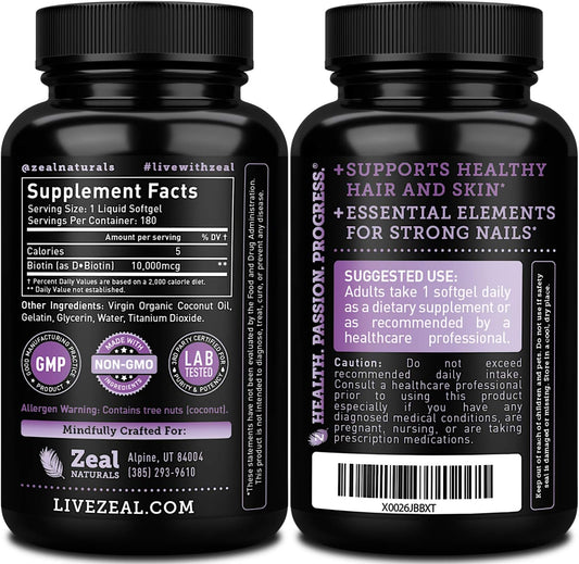 Biotin with Coconut Oil 10000mcg (180 Softgels) - Hair, Skin, Nails Vitamins - Women & Men Hair Growth Supplement