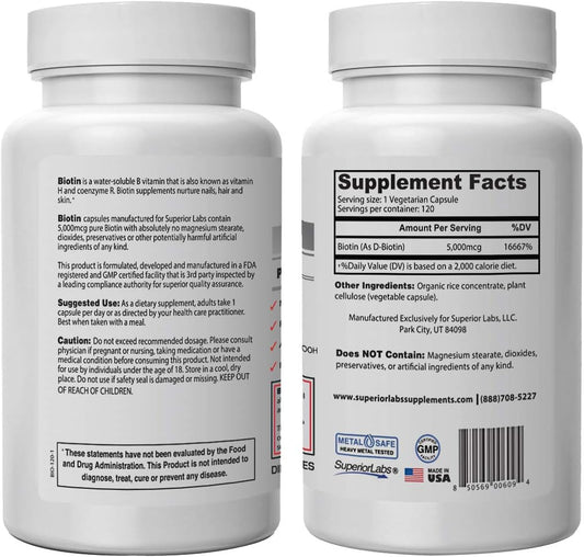 Premium Non-GMO Biotin Supplement for Hair, Skin, Nails - 5000 mcg - 120 Vegetable Capsules - Energy Booster - Healthy Weight - Superior Labs