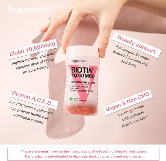 VEGEPOWER Biotin Gummies 10000mcg with Vitamin C, A, D, B-Complex, Folate, Zinc - Vegan Hair Growth Supplement for Women - Non-GMO Strawberry Gummy Bears, 120ct