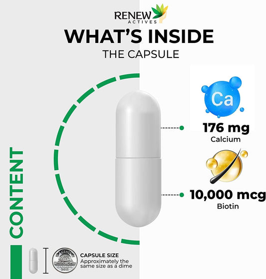 Renew Actives Biotin & Calcium 10000mcg Capsules for Hair, Skin, Nails - Supports Bone & Teeth Health - Prevents Biotin Deficiency - 120 Count