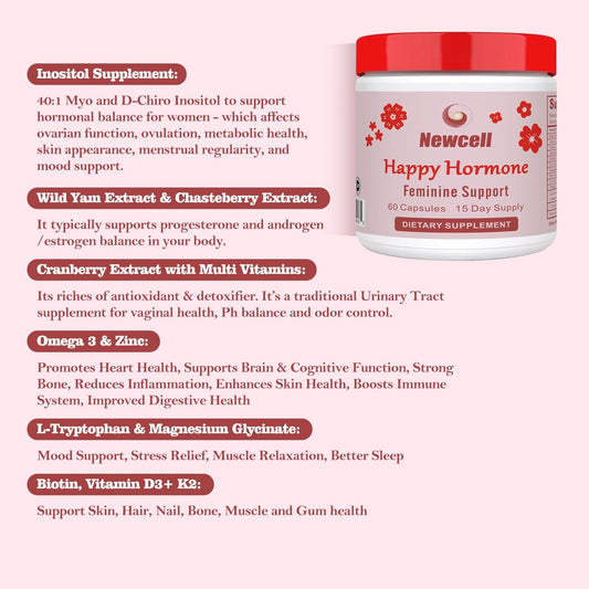 Happy Hormones & PCOS Support - Inositol Multivitamin with Myo-Inositol, Magnesium, D-Chiro Inositol, Omega 3, Vitamin D3, Zinc - 60 Capsules for Women's Health & Hormone Balance