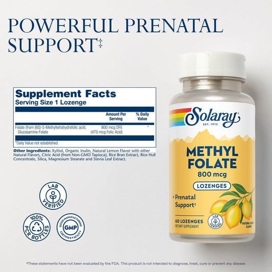 Solaray Methyl Folate 800 mcg with 5-MTHF Prenatal Vitamins - Natural Lemon Flavor - Lab Verified - 60 Servings, 60 LozengesVendor:SOLARAYRegular price $112.94 AUDRegular priceUnit price / per