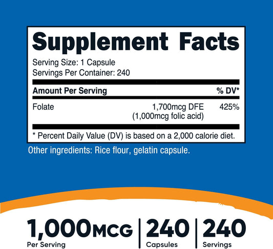 High Potency Folic Acid (Vitamin B9) 1000 mcg Dietary Supplement - 240 Capsules by Nutricost