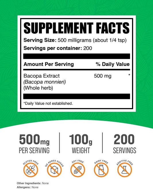 BulkSupplements.com Bacopa Monnieri Extract Powder - 100g (3.5 oz) - Vegan & Gluten Free - 500mg per Serving - Pack of 1
