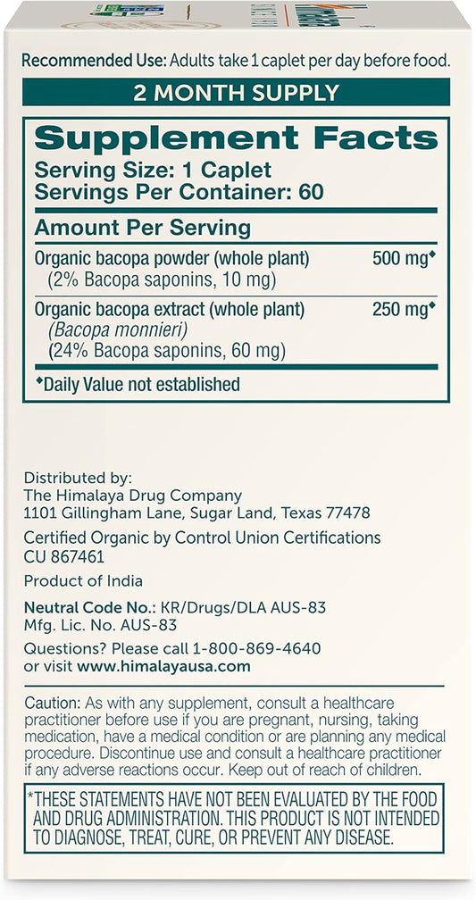 USDA Certified Organic Bacopa Monnieri Nootropic Supplement - 750mg Caplets for Memory & Cognition - Non-GMO - 60 Day Supply