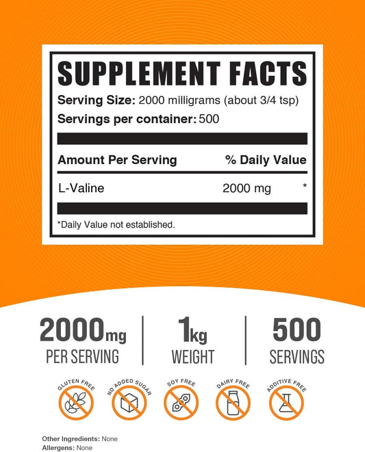 L-Valine Powder Supplement - BCAA Amino Acid Powder, 2000mg per Serving, Gluten-Free - 1kg (2.2 lbs) Pack