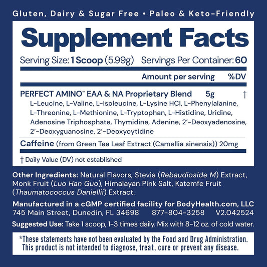 BodyHealth PerfectAmino Powder Mocha Flavor - BCAA & EAA Energy Drink for Muscle Support - Pre & Post Workout Supplement for Men & Women - 60 Servings