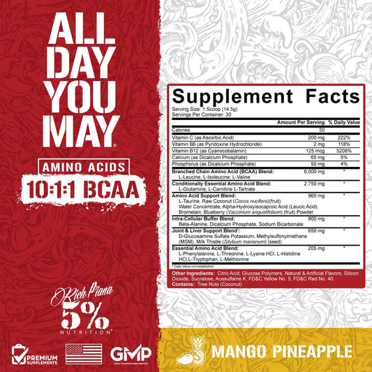 5% Nutrition Rich Piana AllDayYouMay BCAA Powder - Mango Pineapple Flavor - 15.3 oz, 30 Servings - Premium Amino Acids for Workout Recovery & Hydration