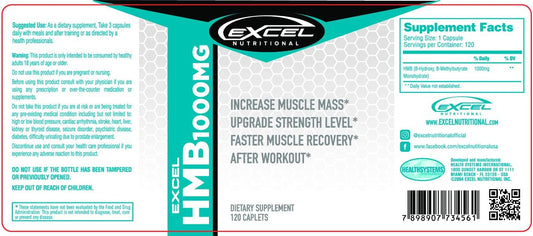 Excelnutritional HMB Capsules - 1000mg per Capsule, 120 Count - Natural Stamina, Endurance, Strength, and Metabolism Support