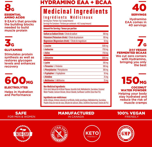 Vegan Peach Rings Hydramino EAA + BCAA Powder - 40 Servings - Electrolyte & Amino Acid Supplement for Recovery, Strength, & Hydration - 7g BCAAs, 8g EAAs, 600mg Electrolytes