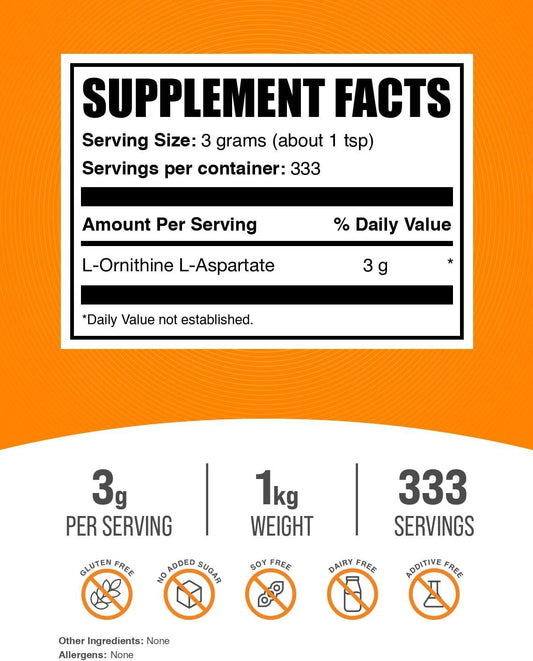 BulkSupplements.com L-Ornithine L-Aspartate Powder - Pure Amino Acid Supplement, Gluten Free, 1kg Pack - Ornithine Powder with 3g per Serving