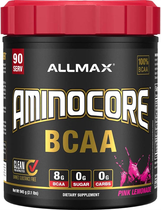 ALLMAX Nutrition AMINOCORE BCAA Powder, Pink Lemonade Flavor with B Vitamins - 945g, 90 Servings - 8.18g of BCAAs Per Serving - Sugar Free and Filler-Free