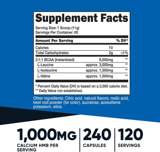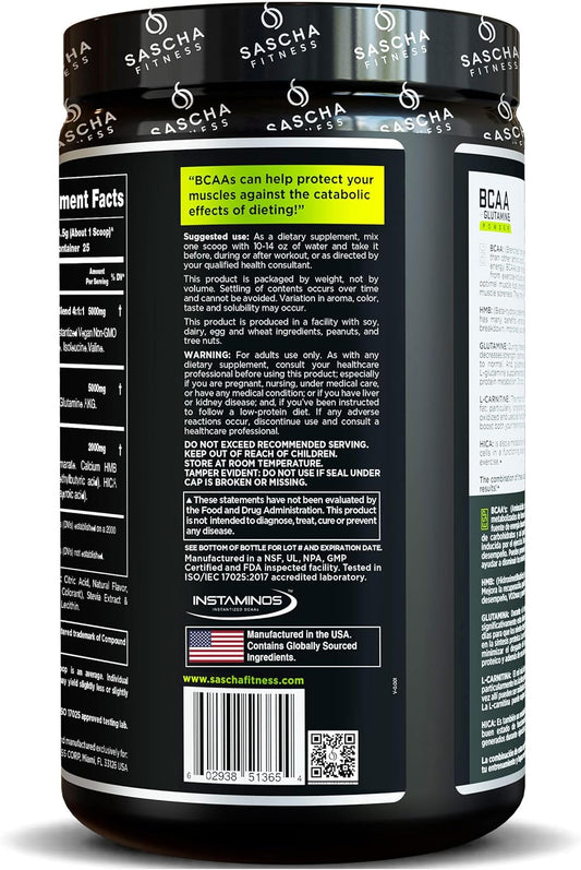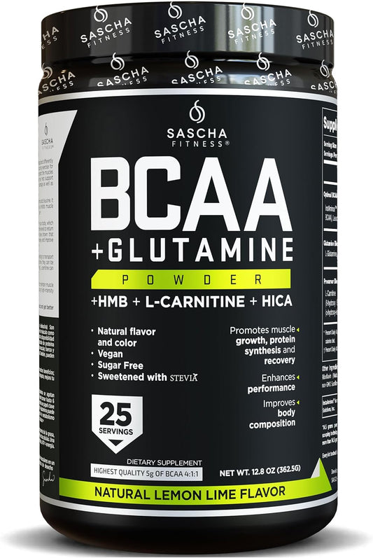 SASCHA FITNESS BCAA Powder Blend with Glutamine, HMB, L-Carnitine, HICA - Natural Lemon Lime Flavor, 362.5g