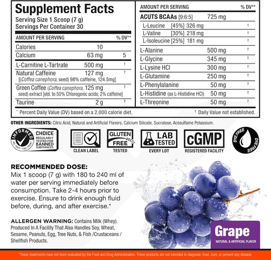 ALLMAX Nutrition A:CUTS Amino-Charged Energy Drink, Grape Flavor - 210g - Caffeinated with Green Coffee Extract, L-Carnitine, and Taurine - Sugar & Gluten Free - 30 Servings