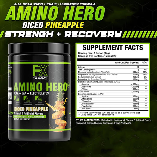 FXSUPPS Amino Hero Diced Pineapple Post-Workout Recovery Drink | Energy Powder with BCAA, EAA, Electrolytes | Boost Endurance and Muscle Health - 25 Servings