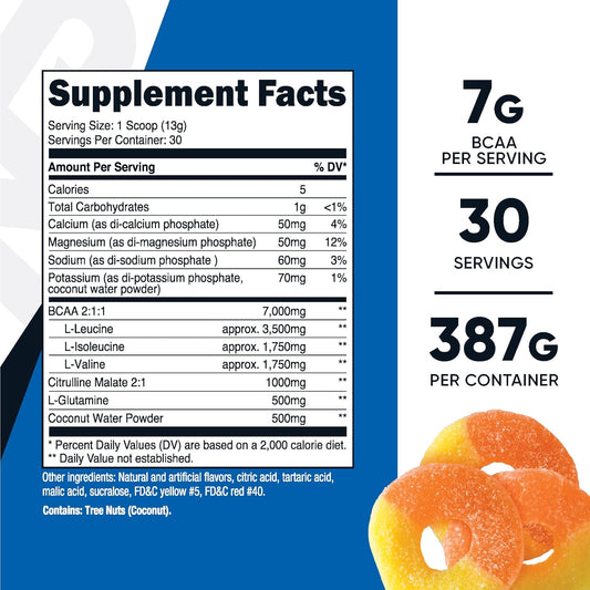 Nutricost Peach Rings BCAA Hydration Powder - 30 Servings, Gluten-Free & Non-GMO - Hydration Complex with Branched Chain Amino Acids