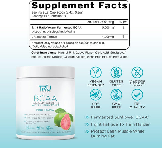 Plant Based TRU BCAA Powder - Vegan Friendly, Zero Calories, Pink Guava Flavor - 30 Servings