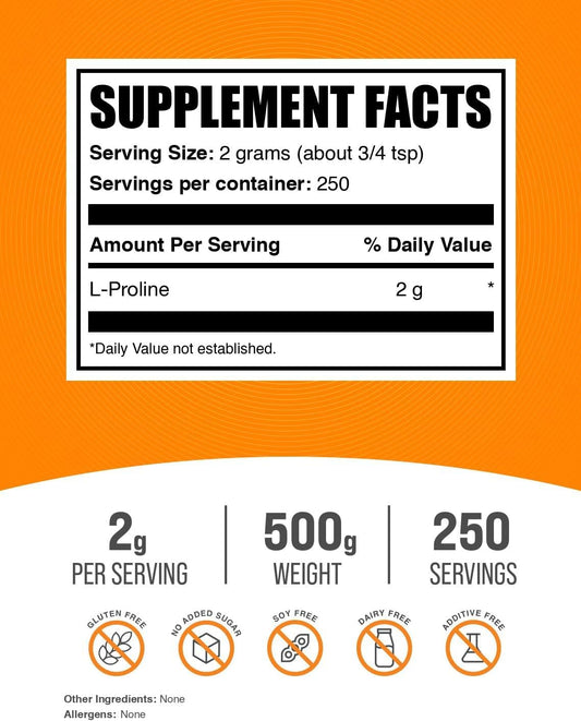 BulkSupplements L-Proline Powder - 2000mg Amino Acid Supplement, Unflavored & Gluten-Free - 250 Servings, 500g Pack