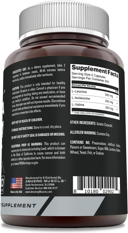 Amazing Nutrition BCAA 2:1:1 1000 Mg Pre-Workout Supplement - 400 Capsules - Non-GMO - Gluten-Free - USA Made