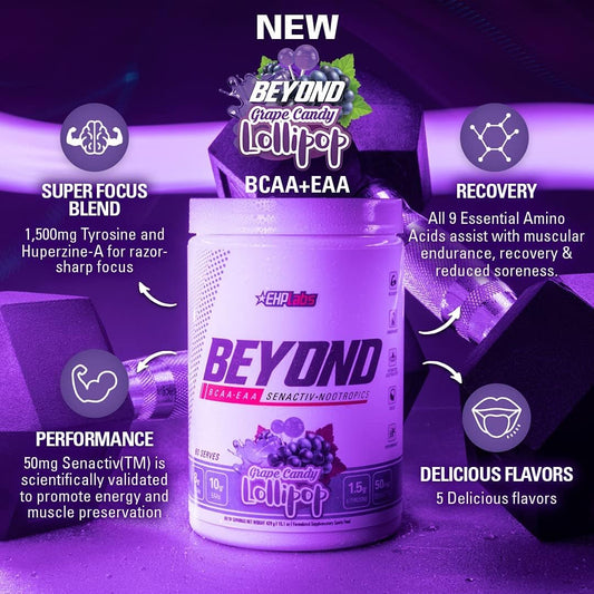 EHP Labs Beyond BCAA Powder: Grape Candy Lollipop Flavor - Essential Amino Acids for Post Workout Recovery, 60 Servings