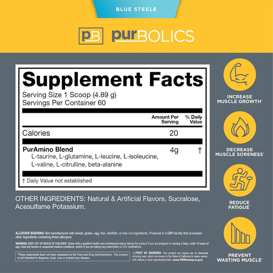 Blue Steele Purbolics Aminos: 4g Free-Form Amino Acids, Beta-Alanine, 0 Sugar, 60 Servings