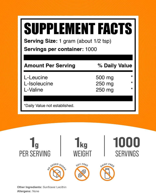 BulkSupplements.com BCAA Powder - Unflavored & Gluten-Free BCAA Supplement, 1000mg per Serving, 1kg (2.2 lbs) Pack of 1