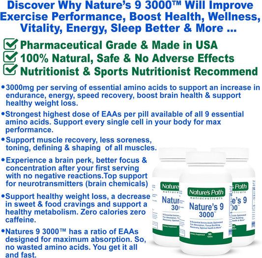 Vegan Aminos 90 Pill Essential Amino Acids Supplement - 3000mg Complex, All 9 EAAs, 1g Per Tablet - Nature's Path Nutraceuticals