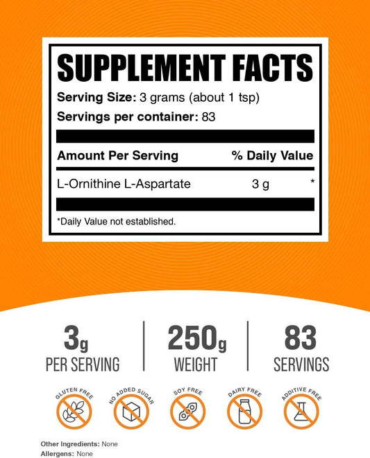 BulkSupplements.com L-Ornithine L-Aspartate Powder - Amino Acid Supplement, Gluten Free, 250g (8.8 oz) (1 Pack)