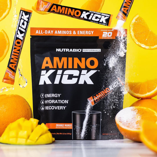NutraBio Amino Kick Orange Mango 20 Servings - All-in-One Performance Formula for Energy, Hydration, Recovery - 6g Amino Acids - Muscle Building Support