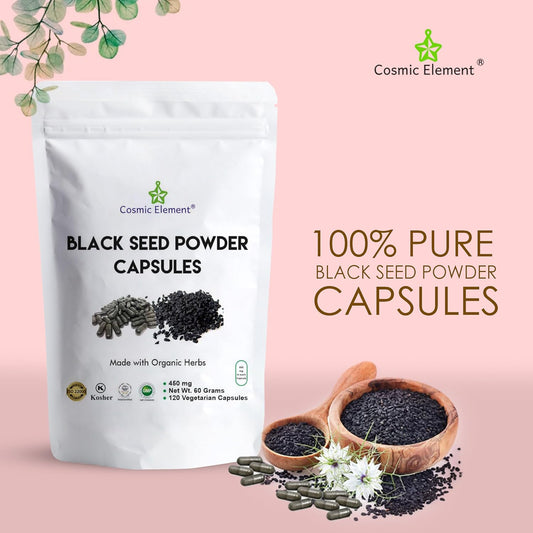 Organic Cosmic Element Black Seed Powder Capsules - 100% Pure Nigella Sativa for Health - 120 Capsules of Vegan Black Cumin Seeds (450mg)