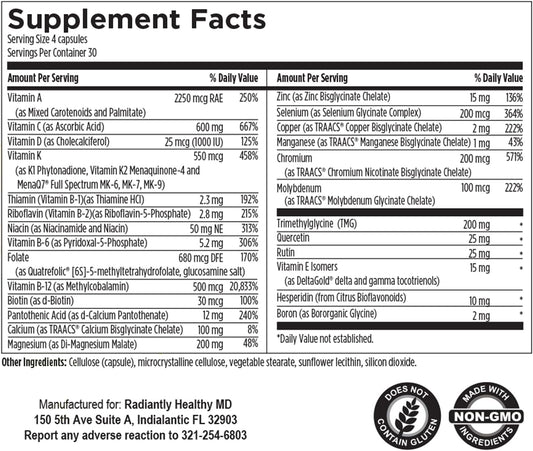 RHMD Wellness Radiantly Healthy Multivitamin & Mineral Supplement (120 Capsules) - Iron-Free Formula with Folate for Overall Health