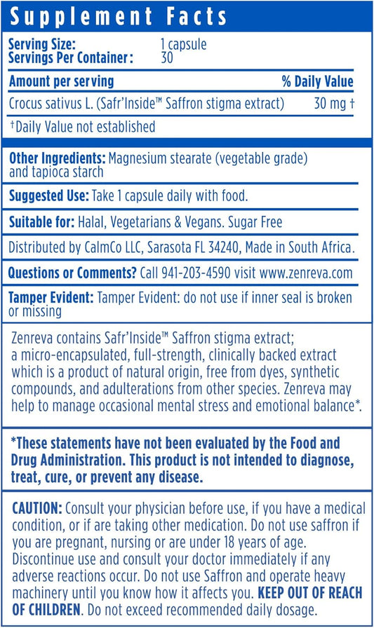 Zenreva Vegetarian Capsules with Safr’Inside Saffron Extract - Natural Relief for Anxiety, Stress, and Emotional Balance - 30 Count