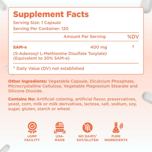 High Strength Bioactive SAM-e 400mg Supplement for Joint, Liver, and Mood Support - Vegan, Non-GMO, Preservative Free - Made in the USA - 120 Servings