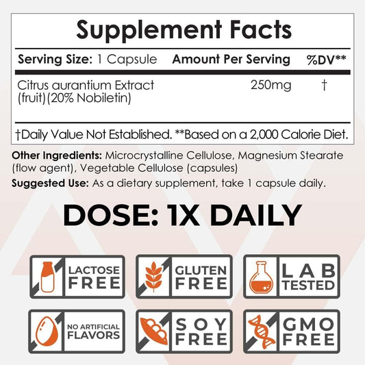 Nootropics Depot Nobiletin Capsules 250mg - 30 Count - 20% Extract - Citrus Aurantium - Cognitive & Metabolic Support - Cardiovascular Function