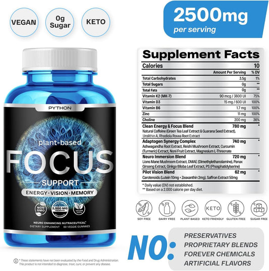Python Focus Nootropic Brain Supplement with Lions Mane, Lutein, and Vitamins - 60 Vegan Chews - Boost Memory and Concentration