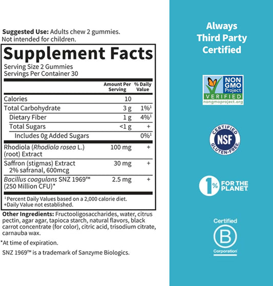Herbal Stress Relief Gummies with Rhodiola & Saffron for Positive Mood, Prebiotics & Probiotics - Non-GMO, Gluten-Free, Kosher (30 Servings)