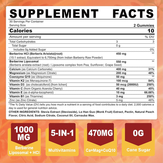Sugar-Free LILICARE Berberine Gummies with Liposomal Berberine HCI, Calcium, Magnesium - Vegan & AMPK Activator for Energy & Metabolism - 1 Pack