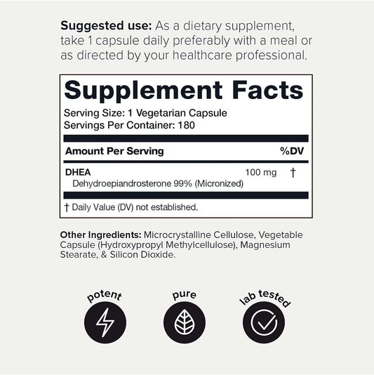 Highly Purified Micronized DHEA 100mg Supplement for Men and Women - Ultra Strength 99%+ Bioavailability - 180 Capsules
