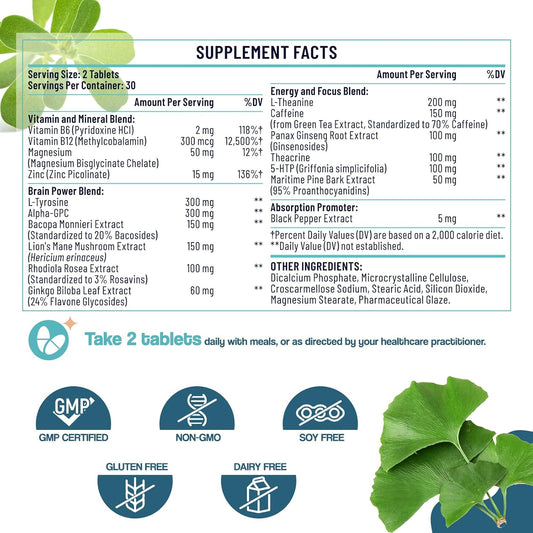 Natural 17-in-1 Nootropic Brain Supplement for Memory, Focus, and Mental Clarity - Herbal Extracts, Vitamins, Amino Acids - 60 Tablets