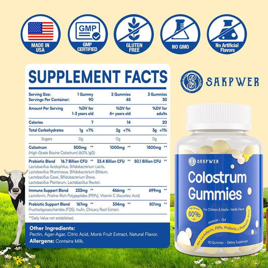 Vanilla Flavored Sugar-Free Bovine Colostrum Gummies with 60% IgG - Probiotics & Prebiotics for Adults & Kids - 90 Gummies