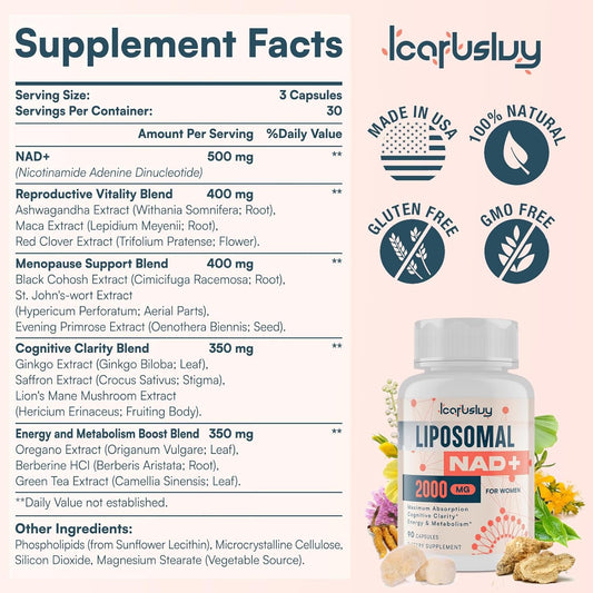 IcarusIvy Liposomal NAD+ Supplement for Women & Menopause Support - 2000MG with Ashwagandha, Maca, Black Cohosh & Ginkgo Biloba - Max Absorption Capsules for Cognitive Clarity, Energy, and Aging Defense